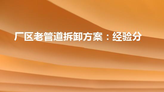 摘要:本文主要介绍了厂区老管道拆卸方案:经验分享与操作指南。通过对破旧厂区的实践,在下面的方面逐一对老管道的拆卸和处理进行了详细介绍,包括:方案设计、拆卸工具、安全措施、拆卸顺序、废弃物回收和环境修复。本文的重点是分享在实际操作中所获得的有用经验,为拆卸废弃厂区的工作提供指导。