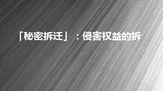 中国的城市化进程一直在加速,随之而来的是大规模的城市拆迁。但在这些拆迁背后,我们常常会看到一些秘密拆迁的现象。这些拆迁侵害了无数居民的合法权益,给他们带来了沉重的打击和伤害。本文以「秘密拆迁」:侵害权益的拆迁背后,谁是幕后黑手?一众受害者的故事揭开悲情真相。为主题,探讨了这些拆迁背后的真相和幕后黑手。