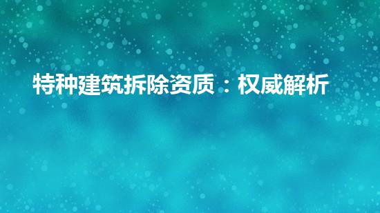 特种建筑拆除行业是做好危害日益增加的建筑工程拆除中非常重要的一项工作。拆除企业需要不断学习新技术、遵守法规、标准,才能为用户提供更加优质的服务。希望本文可以帮助读者深入了解特种建筑拆除资质的权威解析与实操指南,更好的从事特种建筑拆除行业,提高拆除工程的安全和效率,实现企业利益和社会贡献的共同体现。